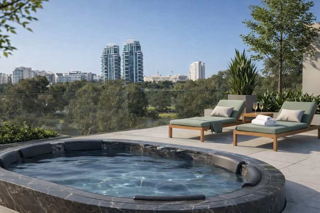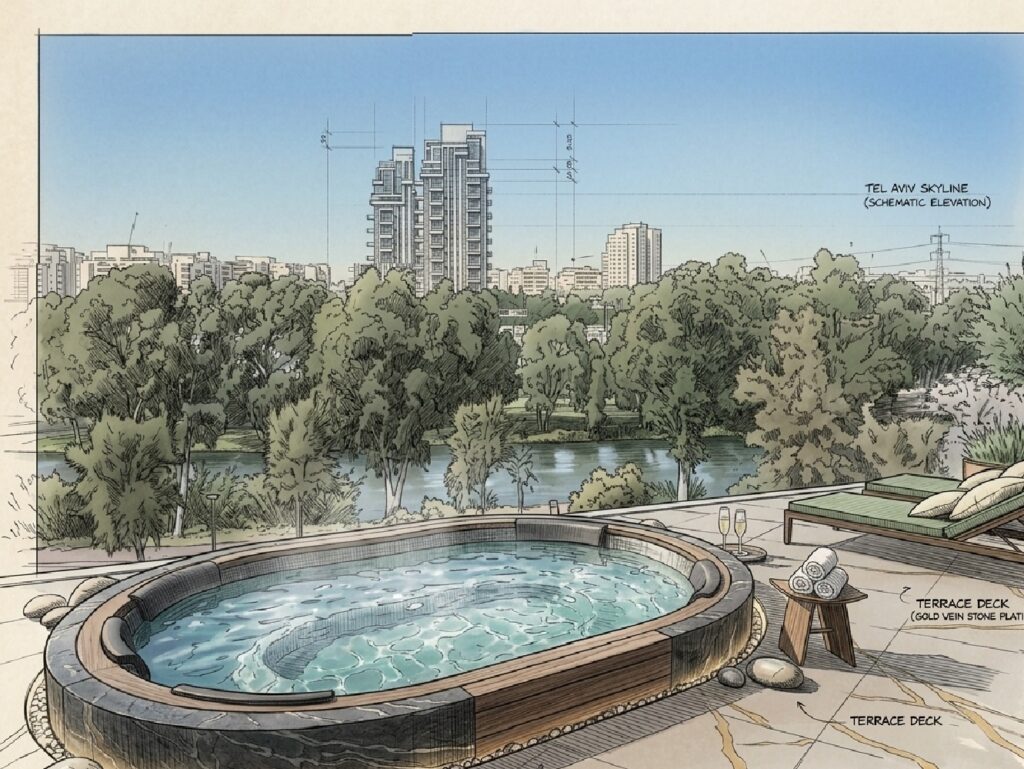 80 מ"ר של מרפסות (55 מ"ר מהסלון, 25 מ"ר מחדר שינה הורים) ובריכה פרטית על הגג (גג 66 מ"ר מתוכו בריכה של 21 מ"ר).